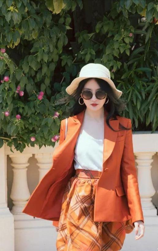 西服套装往往是西装加长裤,而现在西装加半裙的搭配也成为了潮流人士的另一个选择,刘亦菲选择了橙色的翻领西装,不仅能够显出她稳重成熟的气质,搭配同色的半身格纹裙后,让造型的时髦度更为爆表。选用白色T恤作为内搭,对于穿搭小白来说也十分容易轻松穿出简约耐看的效果。