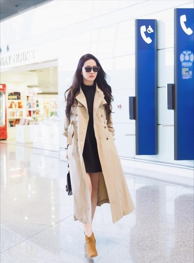 卡其色是时尚界一直很推崇的颜色,这种基础色用来搭配造型是非常简单的,刘亦菲身着的这件A字型的翻领卡其大衣,自带了超强的气场,走路带风,气场全开,内搭黑色的高领针织长裙,能秀出它的修长双腿,整体效果既统一又和谐,看起来干净利落。