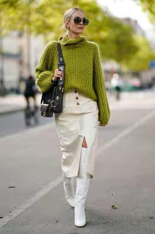 想要将上松下紧的穿搭法则凸显的淋漓尽致,就必须要记住在服装单品上的搭配,以及对于色彩、面料的把控力度。在冬季作为内搭来说上松下紧的单品可以选择高领毛衣、棉麻制品包臀裙,不仅可以起到保暖的作用,将毛衣塞进裙身还很好的修饰了腰部曲线!