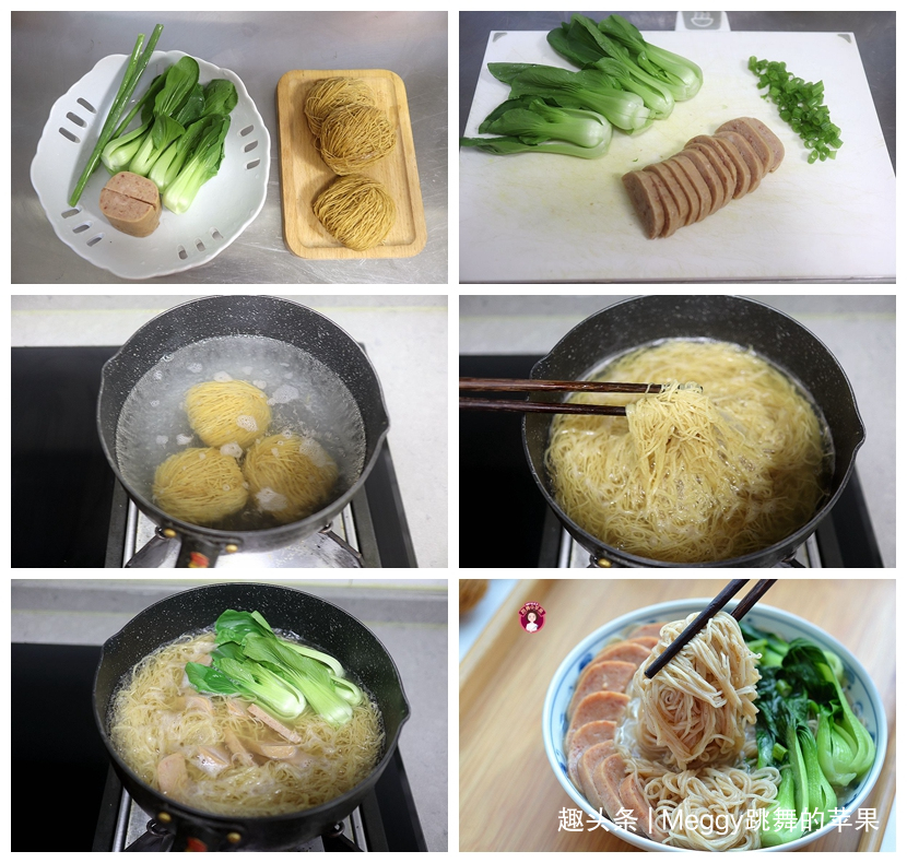 材料: 虾仔面饼2块,午餐肉1块,油菜4棵,香葱少许,水适量