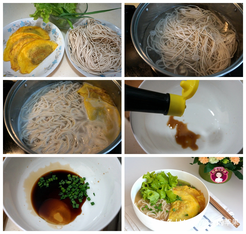 材料:面条1把,蛋饺4个,生菜1把,鲜味汁适量,生抽适量,青蒜末少许,香油,
