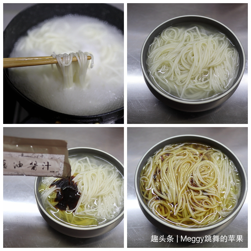 1. 面条入开水锅中,煮3分钟,面条柔软无白芯;