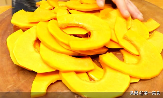 1.准备半个老南瓜,去除里面的瓜瓤和南瓜籽,然后把外皮削干净清洗一下,再切成均匀薄片。