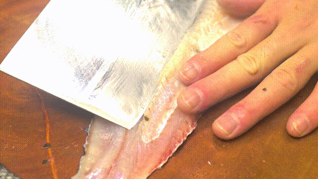 再沿着脊骨把两边的鱼肉都片下来,然后剔除鱼刺。