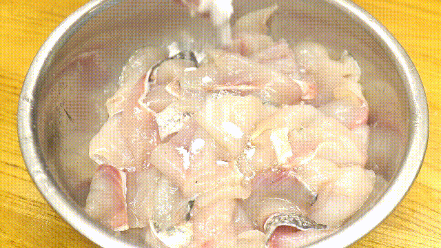 抓拌至鱼片发黏后撒入一小撮淀粉再次拌匀,用淀粉锁住鱼片中的水分腌制5分钟。