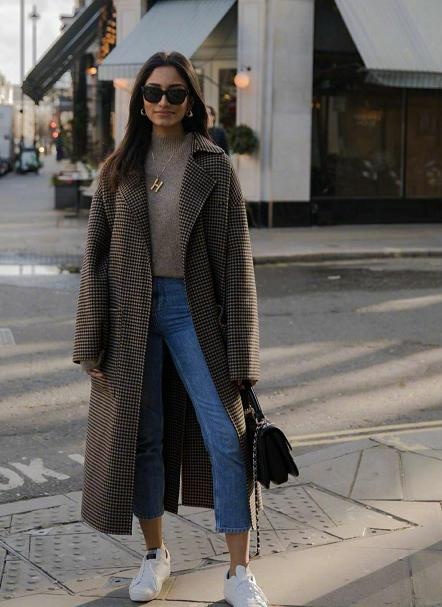 想让整体造型呈现出一定的休闲复古韵味,格纹设计的复古大衣搭配上具有着百搭性能的小白鞋,能自然塑造出不错的减龄复古韵味,让整个人的气质看上去更偏休闲一些。