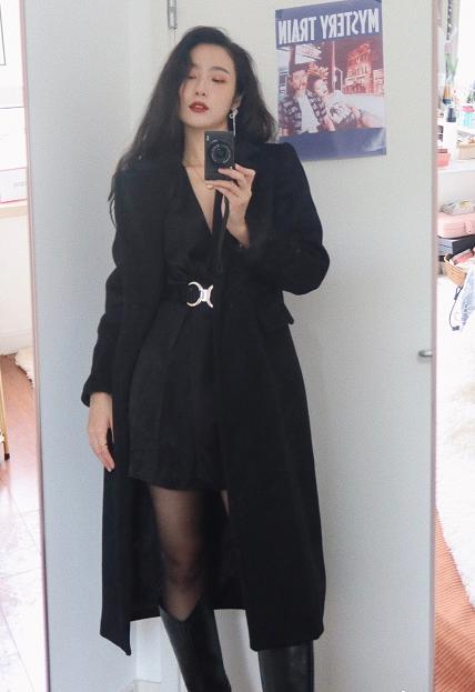 对于那些想要走性感成熟路线的姐妹来讲,这身纯黑的造型搭配就很不错,一件充满着露肤性感韵味的V领收腰连衣短裙,展示曼妙身姿,搭配性感黑色打底,让双腿曲线变得更加性感,在黑色牛仔靴的配合下呈现出更加完美的效果,外搭一件黑色大衣,性感女郎就是你。