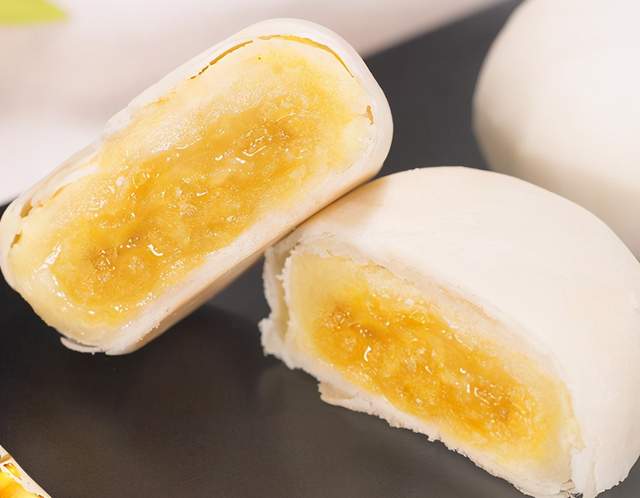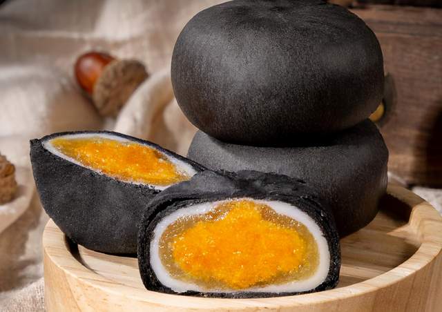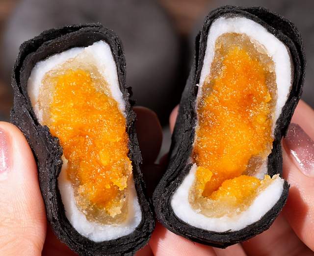 4层结构4层食材,有咸味甜味和香味的集合,酥皮是墨鱼汁面皮,第二层是雪媚娘,第三层是凤梨肉【就是菠萝】,最中间就是整颗的咸蛋黄,丰富的食材,一口吃出三种味道的碰撞,太美妙。