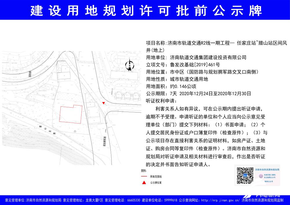 闪电新闻记者了解到,此次一同公示的还有任家庄站至腊山站区间风井(地上)项目,用地位置为市中区国防路与规划拥军路交叉口南侧,用地性质为城市轨道交通用地,用地面积约0.146公顷。