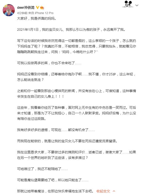 1月2日下午,《巴啦啦小魔仙》凌美琪扮演者孙侨潞的妈妈在社交平台上发文,宣布了女儿去世的消息。“2021年1月1日,我的宝贝女儿、我那么引以为傲的孩子,永远离开了我。”写下这句话的时候,我依然觉得这一切都是假的,这么孝顺的一个孩子,怎么就扔下妈妈就走了呢?自己还是不能相信。