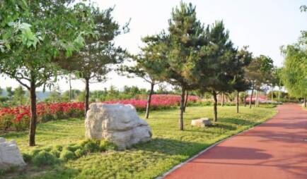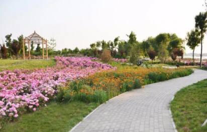 两面指临河一面和临坝一面。对临河一面做的更加疏朗,穿插上更多花卉,临坝一面稍微封闭,耐阴地被栽植相对丰富。公园以环形健身步道为纽带,将园内月季展示、婚庆草坪、玫瑰花谷、月季花田等十四处景区节点串联,并设有亭廊、花架、栈桥、草屋、风车等景观设施。