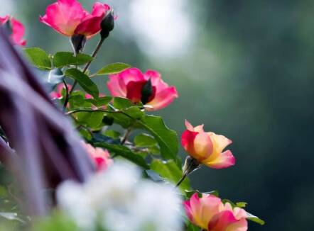 五月月季花开烂漫,市民漫步在园中,满眼皆是月季花的娇容倩影,轻风吹过,落英缤纷,别有一番风韵。