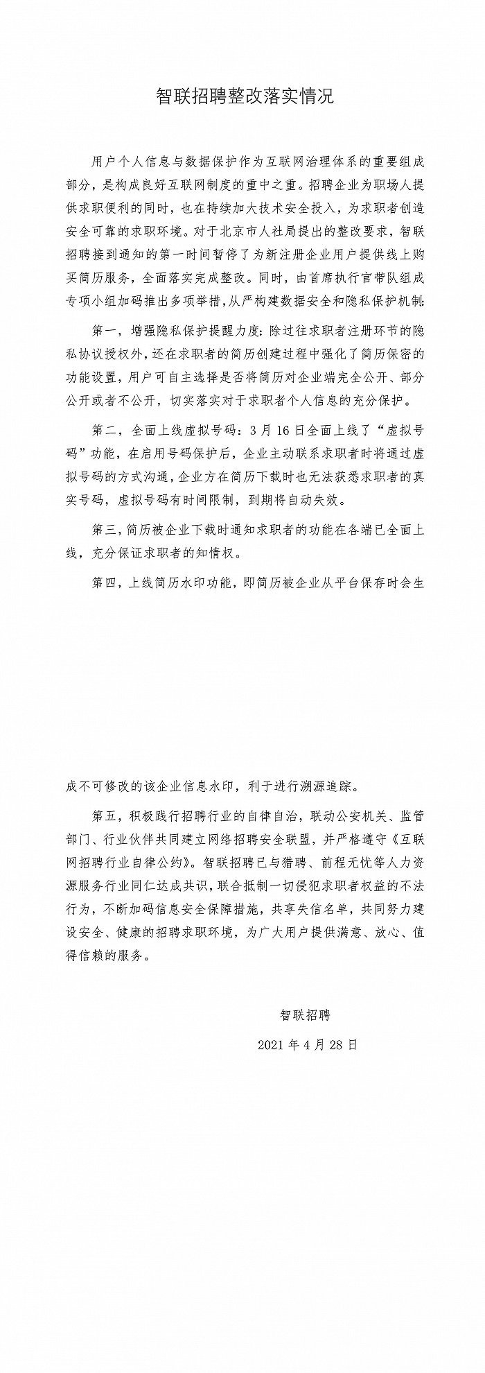 据北京市人社局5月27日消息,针对央视“3.15”晚会点名曝光智联招聘、猎聘网泄露用户个人简历问题,北京市人力资源和社会保障局迅速约谈两家企业,要求立即核实情况、彻查彻改,同时紧急暂停两家企业线上新企业用户购买简历服务。在智联招聘、猎聘进行严肃整改,并经人力资源服务领域和信息安全领域专家论证的基础上,现将两家企业的整改情况予以公示,公示期7天。