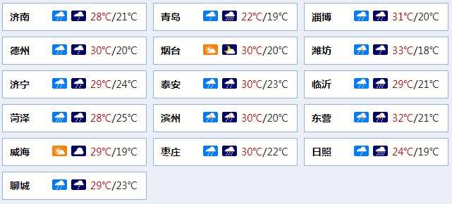 >>>16日白天到夜间,全省天气多云转阴,鲁西北的西部、鲁中的西部和鲁南地区有小到中雨局部大雨并伴有雷电,其他地区有雷雨或阵雨。南风3~4级,雷雨地区雷雨时阵风7~9级。最高气温:鲁西北和鲁中的北部地区30℃左右,鲁东南沿海和半岛南部沿海地区23℃左右,其他地区28℃左右。