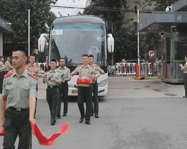 清晨,满载新兵的车辆在老兵们的锣鼓声中驶入营区,官兵们整齐列队,热情迎接新战友的到来。