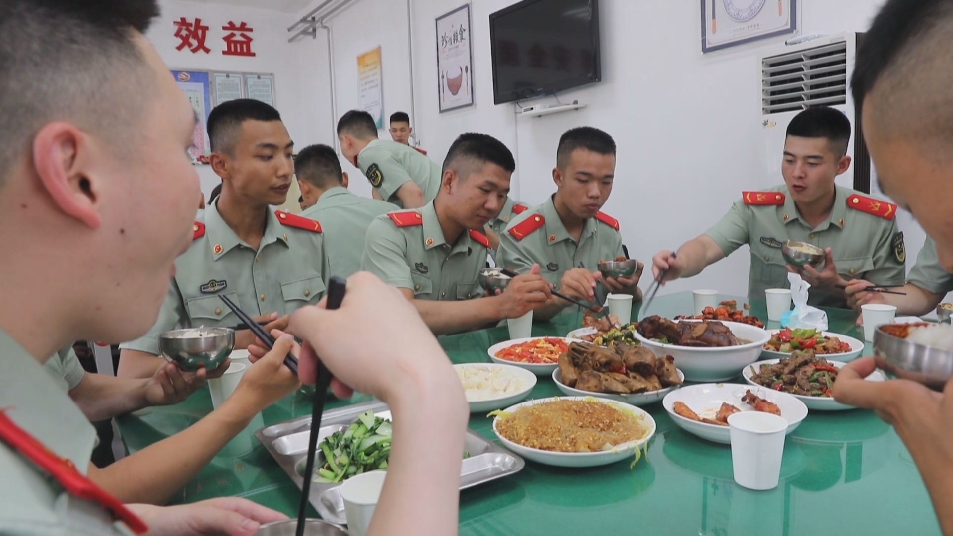 简单收拾内务后,为缓解新兵们一天路途的疲劳,炊事班为新兵们特意准备了丰富的佳肴,作为下连的第一顿饭。