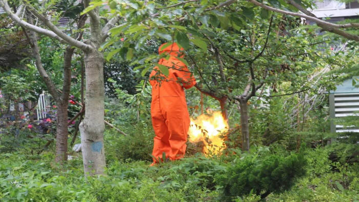 7月17日,上午10时35分,文登区海泰庄园小区内有马蜂窝。消防员到达现场后立刻穿戴好防蜂服,进入马蜂活动区域,对其巢穴进行烟熏销毁。