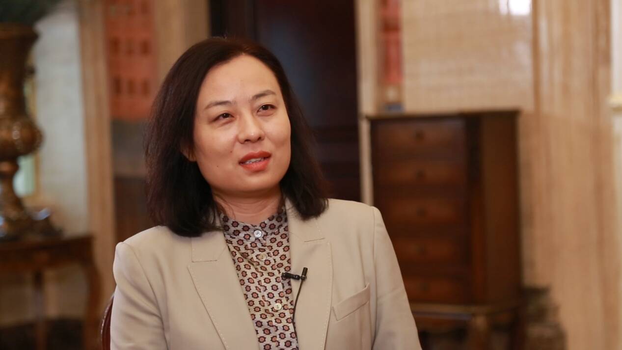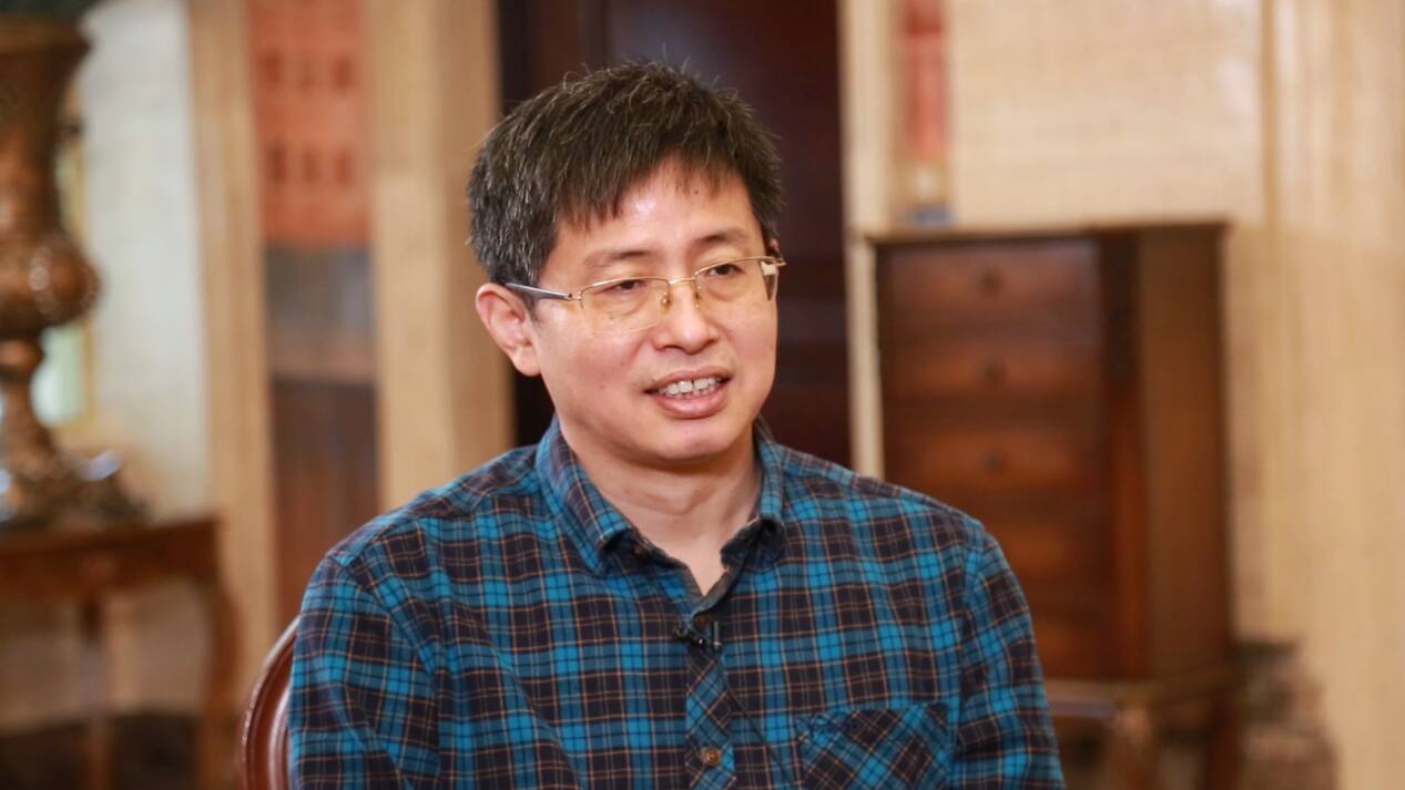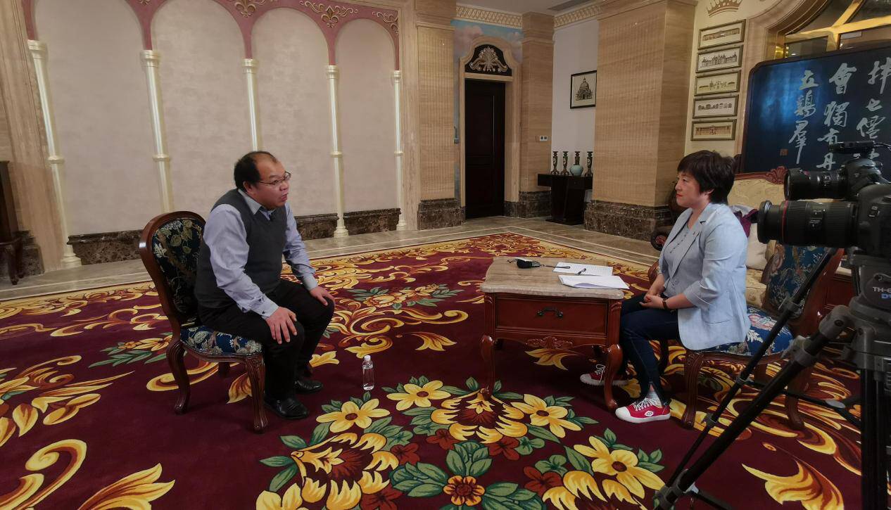参会嘉宾中国人工智能学会会士北京交通大学二级教授于剑(左)接受经济广播记者刘晓琳采访