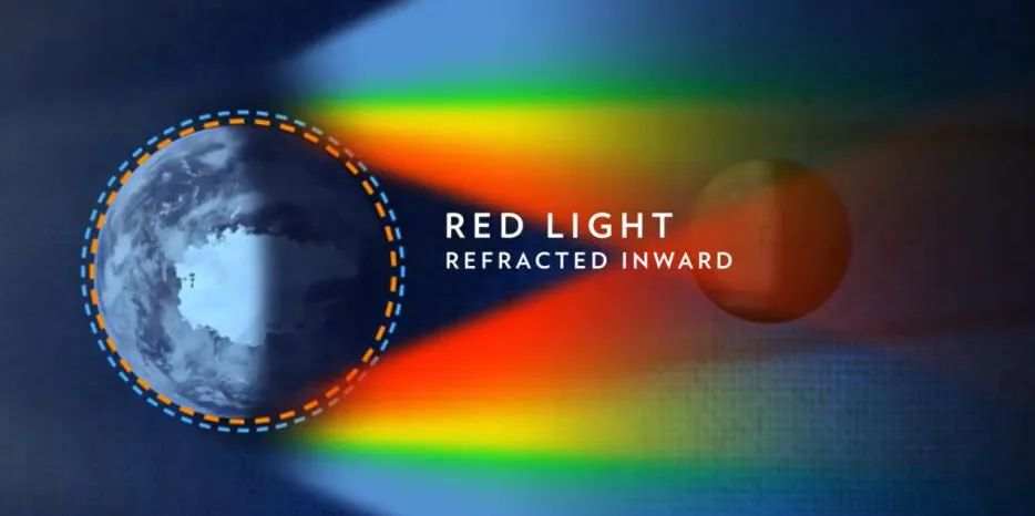 每到月全食天象时都会出现红血月这个称呼,这是由于太阳光穿过地球大气层时发生折射分光的结果,波长最大的红光被偏转后刚好照射在月亮上,而其他颜色的光带则刚好从边上“擦身而过”。