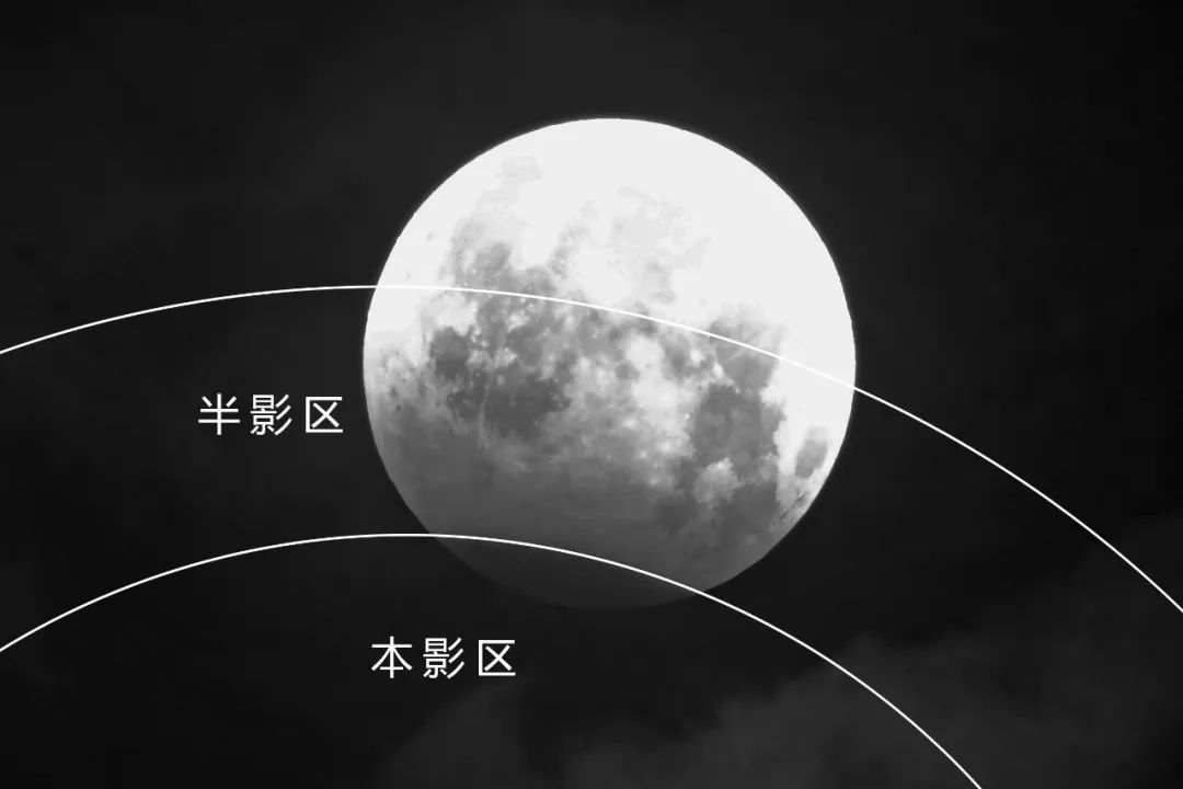 当太阳光照射到地球之后会形成两个影子,一个是完全黑暗的本影区,它位于地球沿太阳光线投影的正后方,还有一个影子在本影区的外面形成一个圆环,这就是半影区。