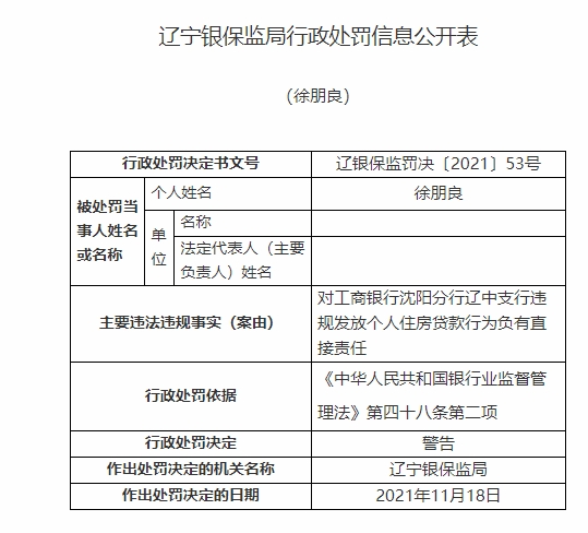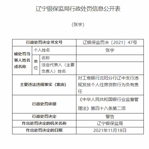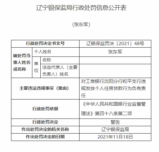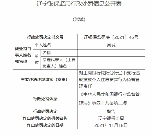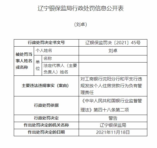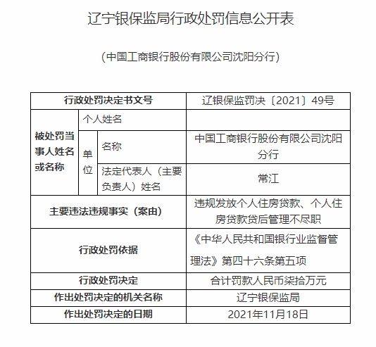 中国工商银行沈阳分行因违规发放个人住房贷款、个人住房贷款贷后管理不尽职被处罚款人民币70万元。刘卓、张东军等2人对上述工商银行沈阳分行和平支行违规发放个人住房贷款的行为负有责任;常城、张宇、徐朋良等3人对上述工商银行沈阳分行辽中支行违规发放个人住房贷款的行为负有责任,5人被予以警告处罚。
