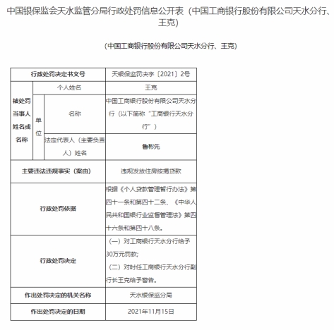 具体案由:中国工商银行天水分行因违规发放住房按揭贷款被处罚款人民币30万元。时任工商银行天水分行副行长王克对上述违法违规行为负责任,被予以警告处罚。