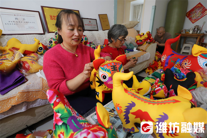1月3日,记者来到了孙秀兰的家里,她正和家人娴熟地制作各种布老虎,一件件布老虎工艺精良,憨态可掬。其中,有一款《平安福“虎”瑞》作品,这只布老虎身长42厘米,颜色靓丽,作品表现手法粗中有细。花纹采用双层或多层、裁剪、粘贴,都是潍县布玩具最早的老工艺制作手法。脊杆造型独特,老虎鼻子的包制和“挂线”,是孙秀兰的母亲孙爱美传授给她的“心中出”。孙秀兰表示,这种制作手法,没有固定模板,上边的丝线,不是缝制,是把一根圆形的丝线,在不打转、不翻滚、只有一个附着面有胶,没有任何标记还能稳固的粘在老虎鼻子上。使用这种“挂线”制作手法,整体缝制起来做工非常考究,把潍县布玩具的老工艺手法体现得淋漓尽致,让作品有浓厚的民间气息和独特的地方色彩等特点。