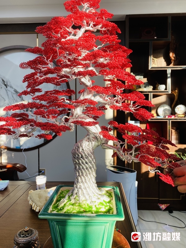 从杨光记事起,他的父母、爷爷、奶奶就做一些手工品,那时候他们主要是做一些箩筐等比较实用的家用物品,小小年纪的他总是喜欢在一边学习。或许是因为从小受家庭影响,喜欢手工工艺的他后来开始用铝线进行创作,做出来的一些花鸟鱼虫,都十分生动。后来,杨光认识了一个潍坊姑娘,两人一起在青州安了家,专业做铝艺艺术品。