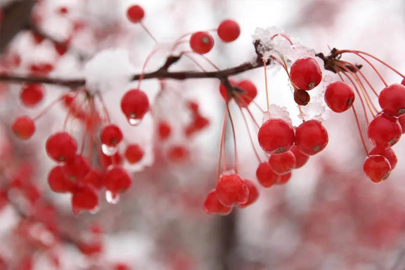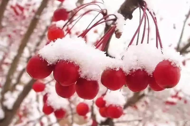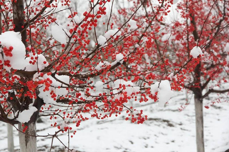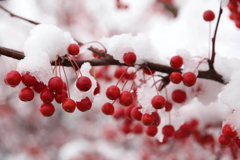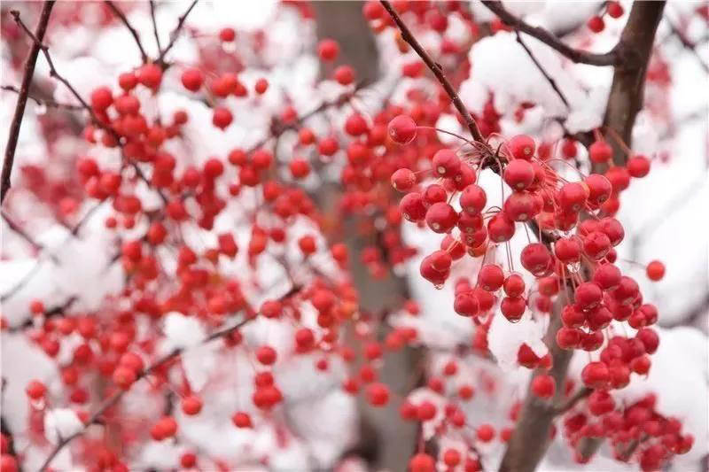 雪中的红色海棠挂满枝头,为这个冬天增添了些许暖意。古诗有云“海棠不惜胭脂色”,说的是海棠花盛开时的娇艳,可是,你见过雪中的海棠果吗?简直美翻了!
