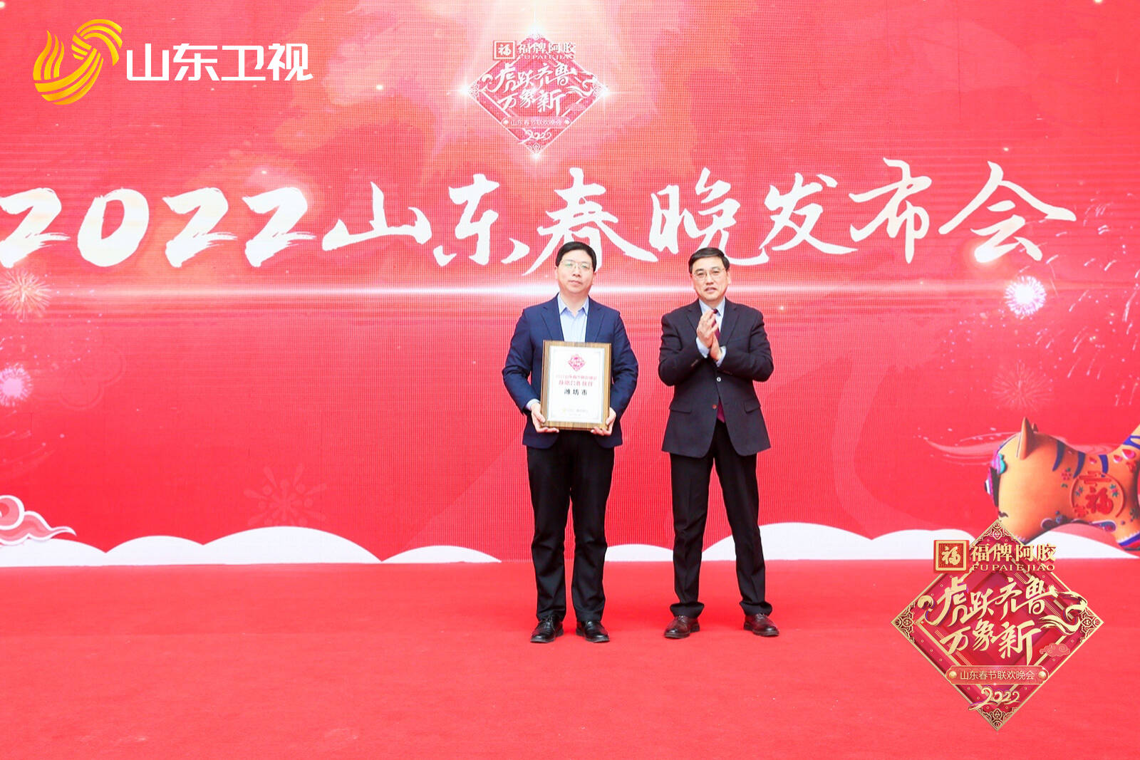 (山东广播电视台副台长郑立波为2022山东春晚独家冠名合作伙伴山东福胶集团授牌)