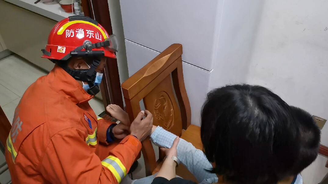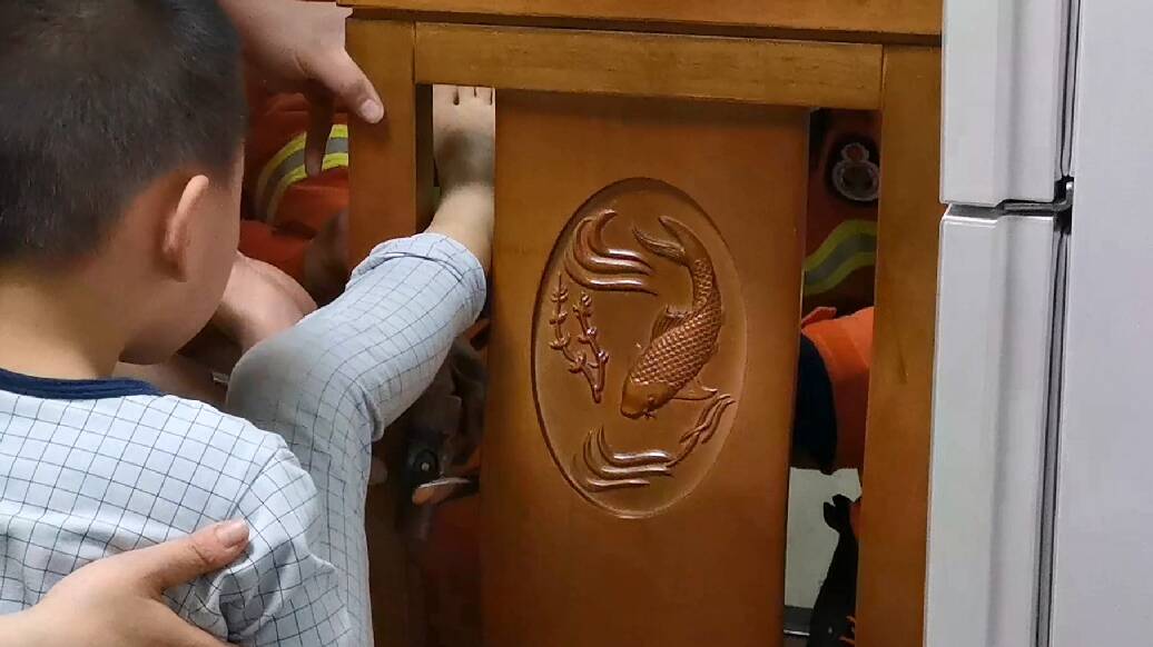 了解现场情况后,现场指挥员在尽可能不破坏财物的情况下制定救援方案。椅子是木制榫卯结构,消防员找到椅子拼接关键点,利用撬棍将缝隙稍微撑大,将男童的脚一点地向外抽。