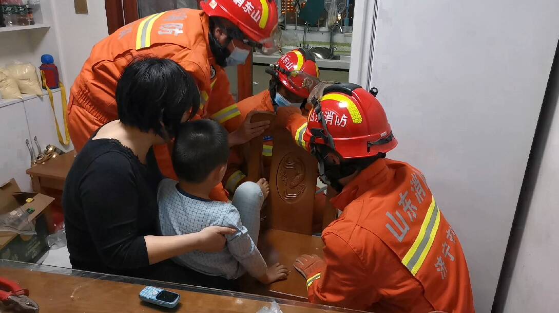 接到报警后,兖州大队立即调派兴隆消防救援站出动一个常规抢险救援单元赶赴现场。到达现场后,消防员发现一名5岁左右的男童右脚卡在椅子靠背的缝隙中无法抽出,其母亲在一旁抱着,焦急地等待消防员的到来。