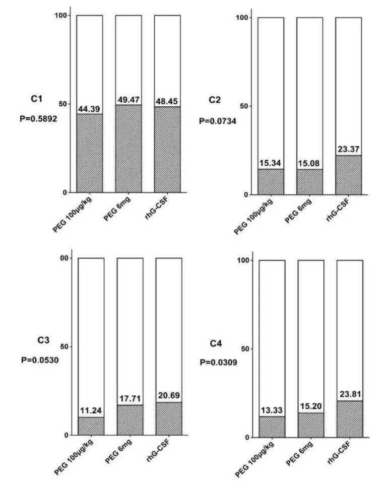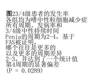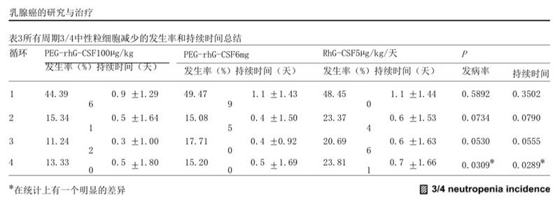 每周期注射一次PEG-rhG-CSF 100µg/kg或6mg3、4度中性粒细胞减少的发生率和持续时间与每日注射rhG-CSF没有明显差异。有趣的是,在第二周期有了很大的差异,在第3、4周期差异变得越来越大,3、4度中性粒细胞减少的发生率和持续时间在第四周期都有了明显统计学差异。