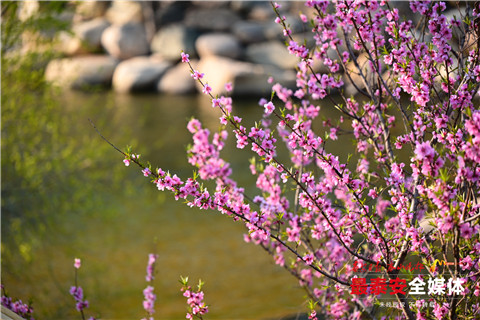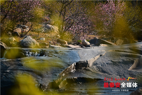 “缘溪行,忘路之远近。忽逢桃花林,夹岸数百步,中无杂树,芳草鲜美,落英缤纷”。彩石溪景区内,桃花开得正艳。山谷之中,溪涧之旁,朵朵绽光彩,一阵风吹来,花瓣飘落,再现唐诗中“桃花乱落红如雨”美景。