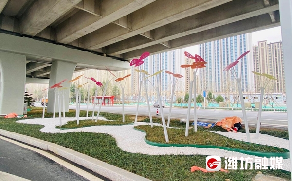 据悉,宝通街快速路实行靓丽景观小品与特色海绵措施相结合的创新设计,让朴素的海绵设施绽放光彩。在重要路口的中央分车带端部,设计白色碎石雨水滞留景观,提亮桥下的灰空间,并在内部点缀充满朝气和活力的雕塑小品,既给桥下空间带来一抹靓丽的色彩,又给道路沿途增加了丰富的视觉观赏点。