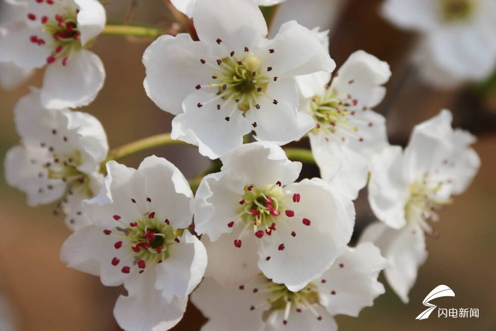 清晨的阳光透过花瓣,朵朵梨花更加晶莹剔透。洁白的花瓣环抱着小喇叭形状的花蕊,花蕊顶端戴着红红的“小帽子”,仿佛可爱的小精灵,微风拂过,小精灵们调皮起来,随风荡漾,好不热闹!洁白的梨花和蓝天最相衬。