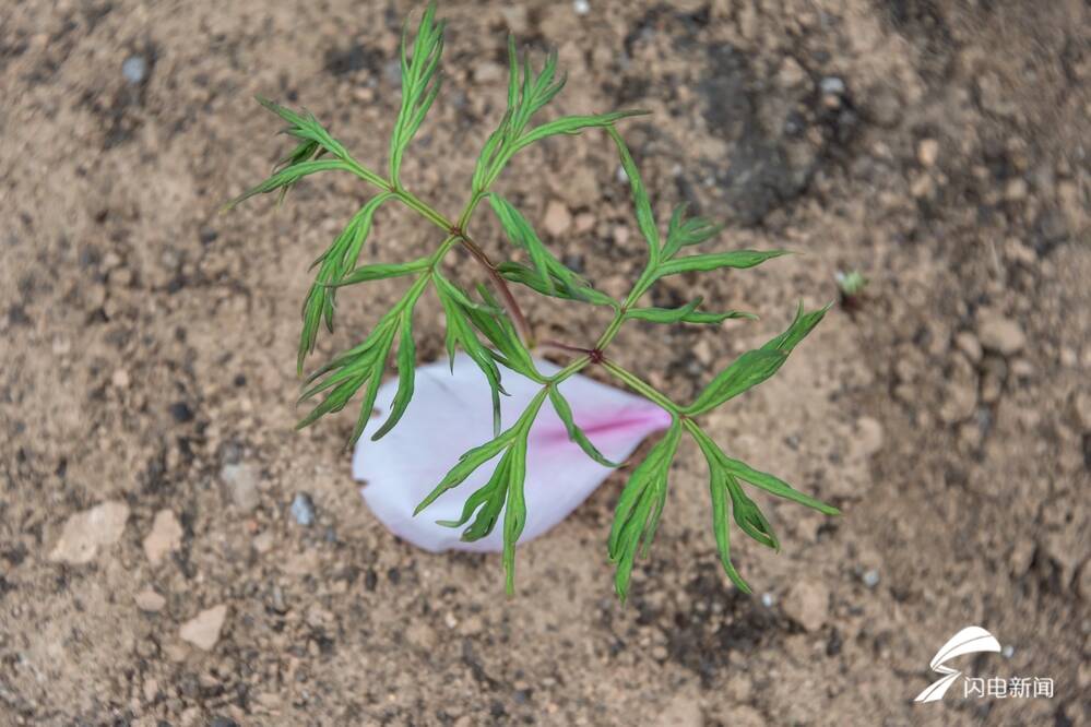 在一瓣牡丹花瓣的映照下,一棵野生牡丹品种的新生苗正茁壮成长。