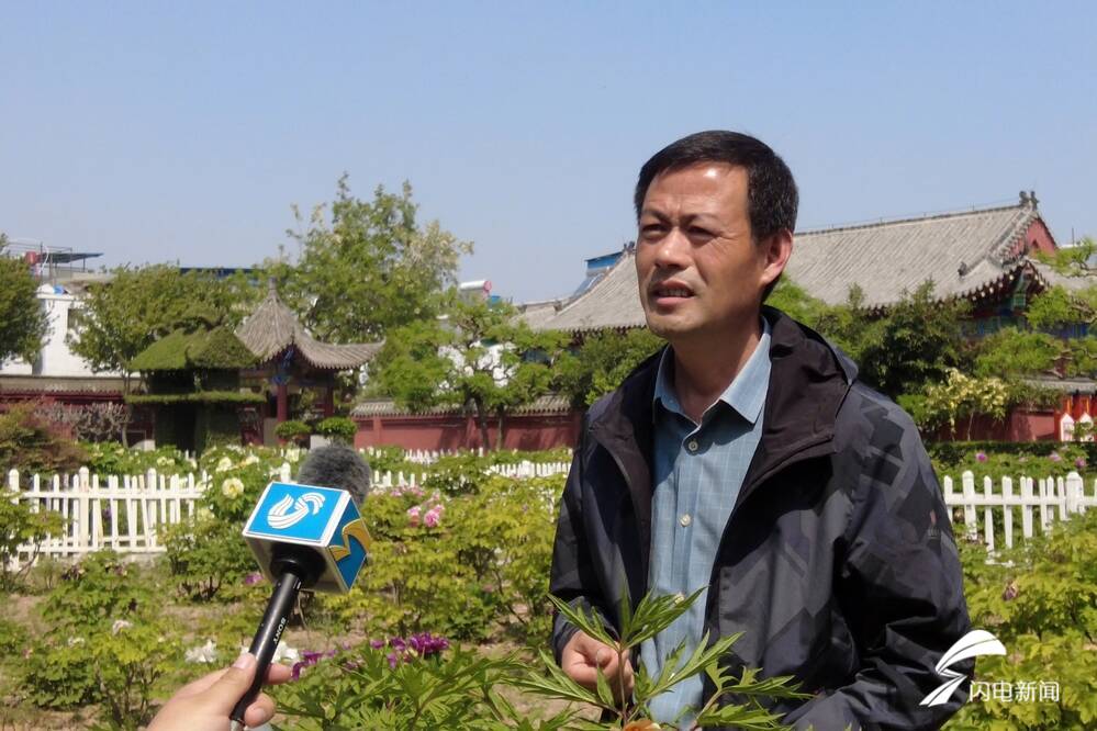 中国花卉协会牡丹芍药分会常务理事、中国牡丹芍药品种审定委员会(七人小组)委员赵效知正接受闪电新闻记者采访