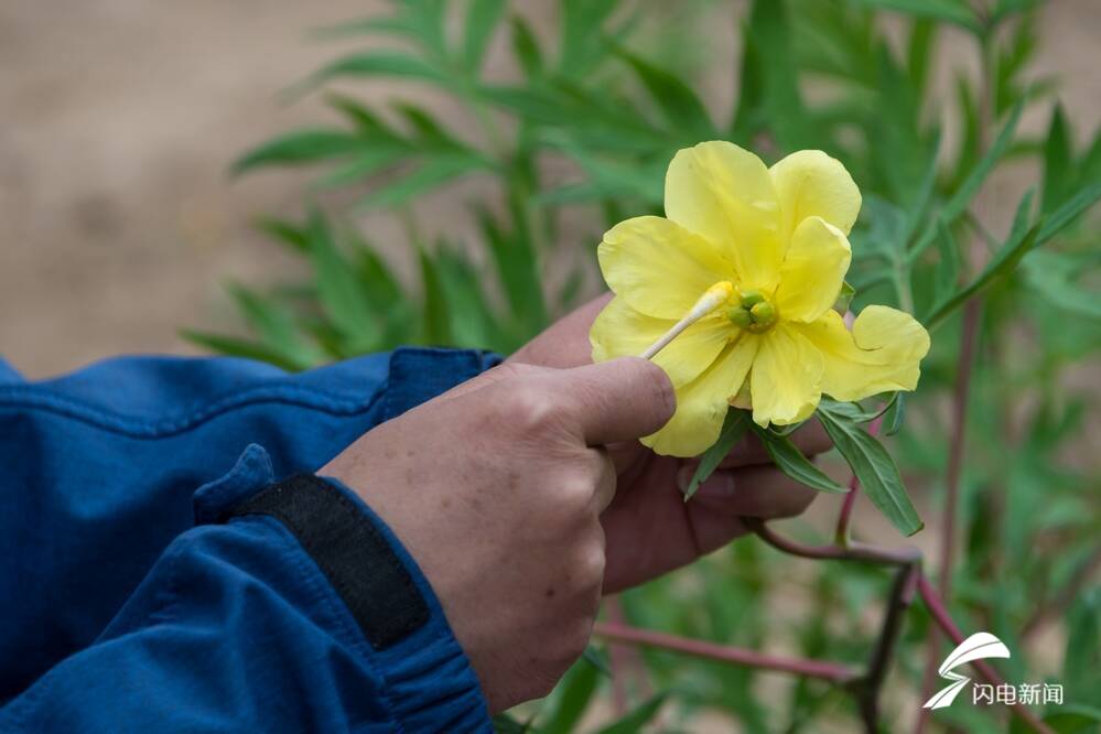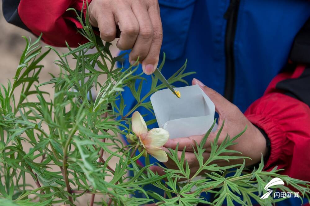 曹州牡丹园的技术人员小心翼翼地把野生牡丹的花蕊收集起来;这个过程叫去雄,就是把野生牡丹的雄蕊去掉,以避免杂交育种失败。