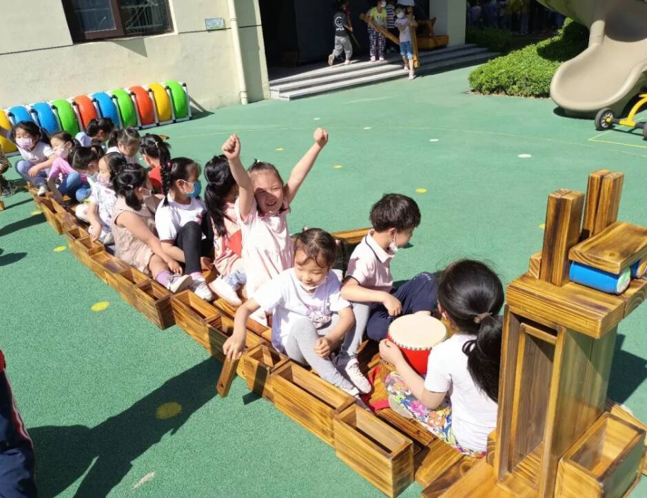 大二班的孩子们分为两队,在小队长的带领下利用操场上的大型积木上,制作完成了两艘“龙舟”,一场精彩的龙舟比赛要开始啦,让我们一起去感受一下现场精彩的瞬间吧!听,操场上传来他们响亮的“一二一二”口号声!