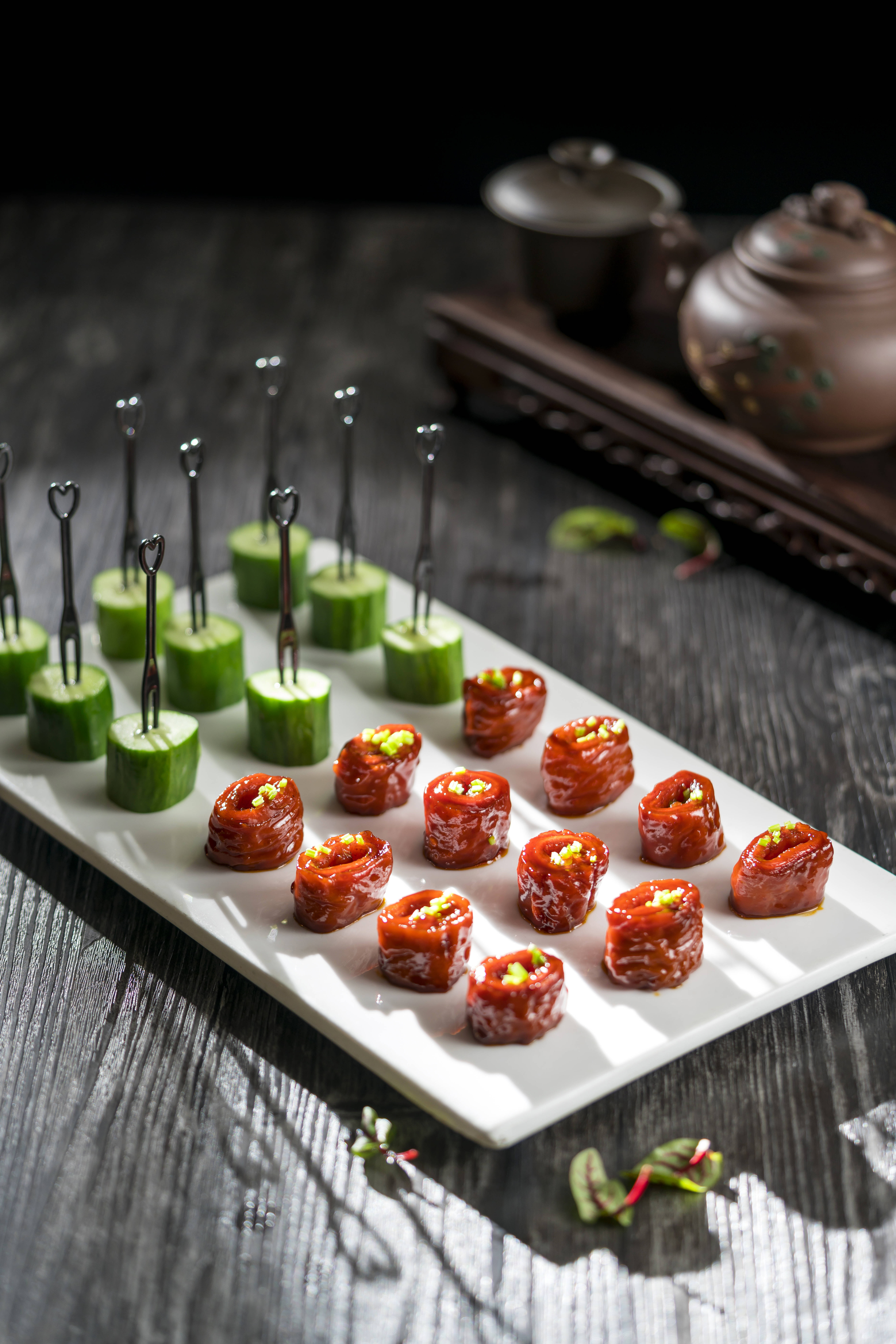 济南传统名菜,为清朝道光年间首创。【九转】出典于道家,道家炼丹有【九转金丹】之说,九转是精烧久炼之意,吃此佳肴,如吃仙丹之美妙。厨师制作此菜像道家【九炼金丹】一样精工细作,故名【九转大肠】。此菜做法别具一格:下料狠,用料全,五味俱有,制作时一焯、二煮、三炸、四烧,出勺入锅反复数次,直到烧煨至熟。口味甜、酸、苦、辣、咸兼有,色泽红润,质地软嫩,肥而不腻。