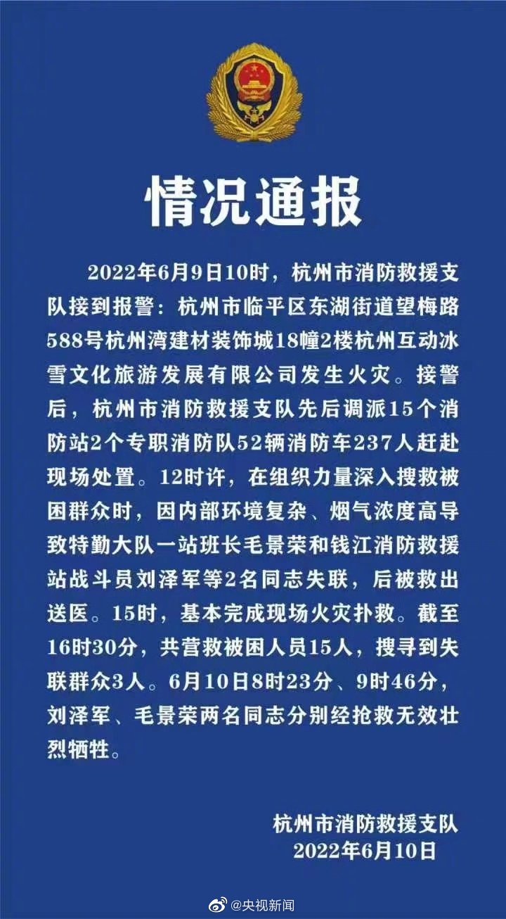 昨天,杭州临平一市场发生火灾。据杭州消防,在组织力量深入搜救被困群众时,因内部环境复杂、烟气浓度高导致特勤大队一站班长毛景荣、钱江消防救援站战斗员刘泽军等2名同志失联,后被救出送医。今天8时23分、9时46分,刘泽军、毛景荣两名同志分别经抢救无效壮烈牺牲。