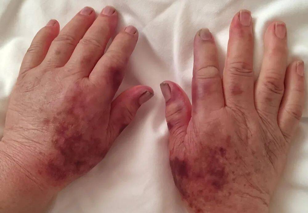 近期,广饶县人民医院皮肤科接诊了一位老年女性患者,她面部暴露部位弥漫分布黑褐色瘀斑、结痂,双手背、手指肿胀,也有少许瘀斑,最要命的是皮损部位每天疼的厉害,让她寝食难安。