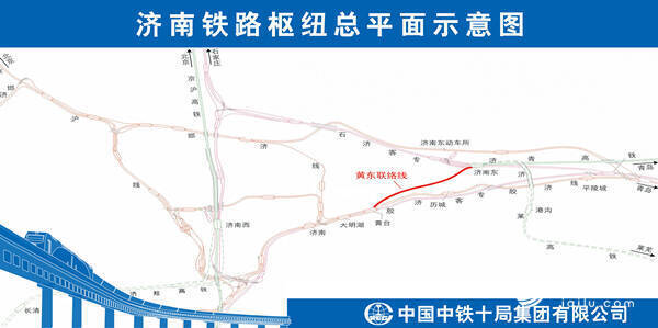 黄东联络线是济南东站、济南站两大铁路客运枢纽站的连接线,由胶济铁路黄台站引出,接入济青高铁济南东站,成为济南铁路枢纽内,济南站与济南东站两大主要客运站的客运连接线。该工程于2020年3月开工建设,为双线城际铁路,运营长度21.26公里,新建线路长度10.5公里,桥梁占比高达65%,设计时速120公里。
