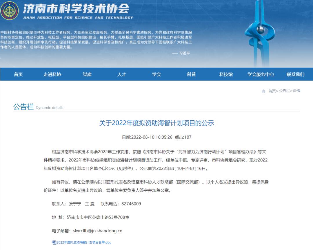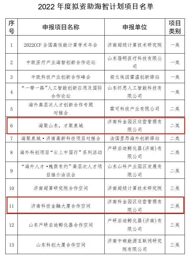 2022年08月10日,济南市科学技术协会发布了《关于2022年度拟资助海智计划项目的公示》,济南科金园区运营管理有限公司(以下简称“科金园区公司”)经历下区科协推荐所立项目--“海聚山东,才聚泉城”项目、“济南科技金融大厦合作空间”成功入围“海智计划”名单。