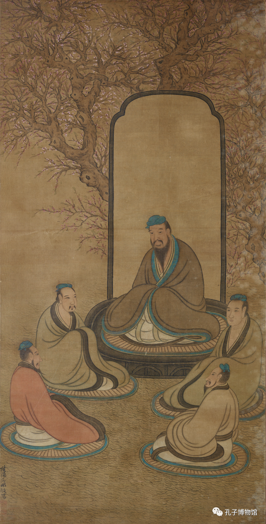 此图为绢本设色。彩绘孔子于杏坛讲学,四弟子端坐受教时的情景。背置屏风,后有杏树,老树新枝,千花万蕊。孔子神态端庄祥和,弟子全神贯注。所绘人物形态各异,面部刻画生动传神。