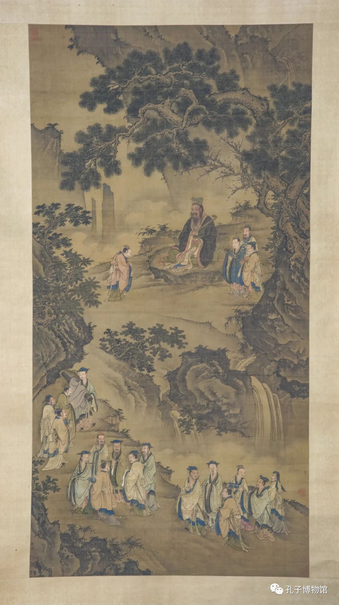 绘孔子于山林瀑布之间的讲学情景。孔子手持如意,端坐于松杏之下。其前有一弟子躬身请教,左有侍立弟子三人,另外的十六名弟子沿山道而上,分成三组,彼此顾盼,交谈自若。高山、块石、瀑布、流水以及劲松、丛树,将不同的场景串联,营造出清旷闲淡的讲学气氛。