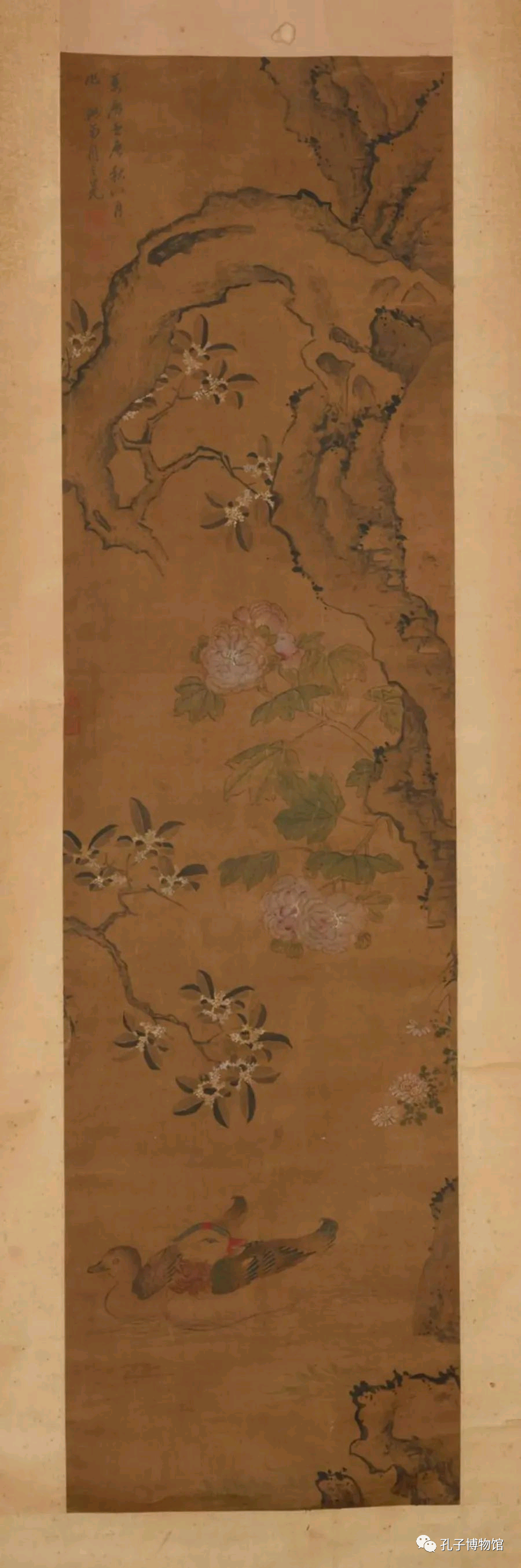 绢本设色。图绘桂树枝干盘桓,花吐芳香,芙蓉盛开,娇艳欲滴,鸳鸯戏水。款署“万历壬辰秋八月汝南周之冕”。白文印为“周之冕印”“周氏”,另两方印文不辨。画于明万历二十年(1592年)。桂树枝干以墨笔皴染,苍劲有力;花蕊、鸳鸯由工笔写成,随类赋彩,刻画细腻。