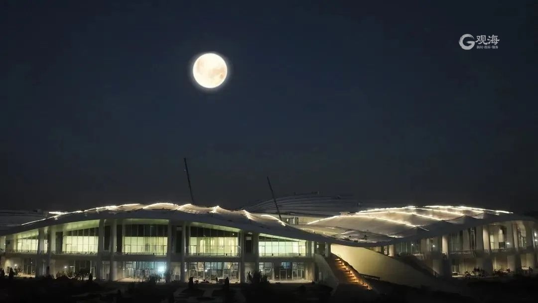 每当夜晚来临,屋面上星星点点的灯光漫射开来,在月光的映衬下,散发出耀眼的光芒,贝壳的造型意境,与星光交相呼应,那美轮美奂的场景跃然眼前。