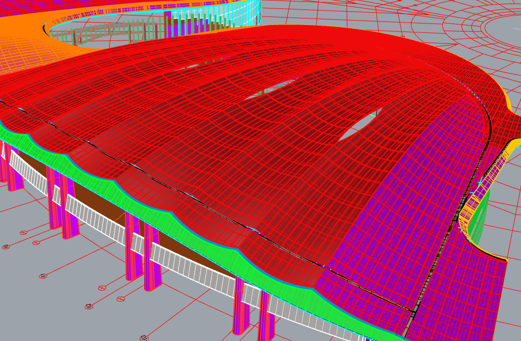 为了表现贝壳的肌理特征,屋面装饰层整体采用双曲异型结构,因龙骨构造异形多变,项目通过深化BIM技术应用,结合图纸构建项目屋面数字化模型,对屋面装饰进行分板、单双曲优化。